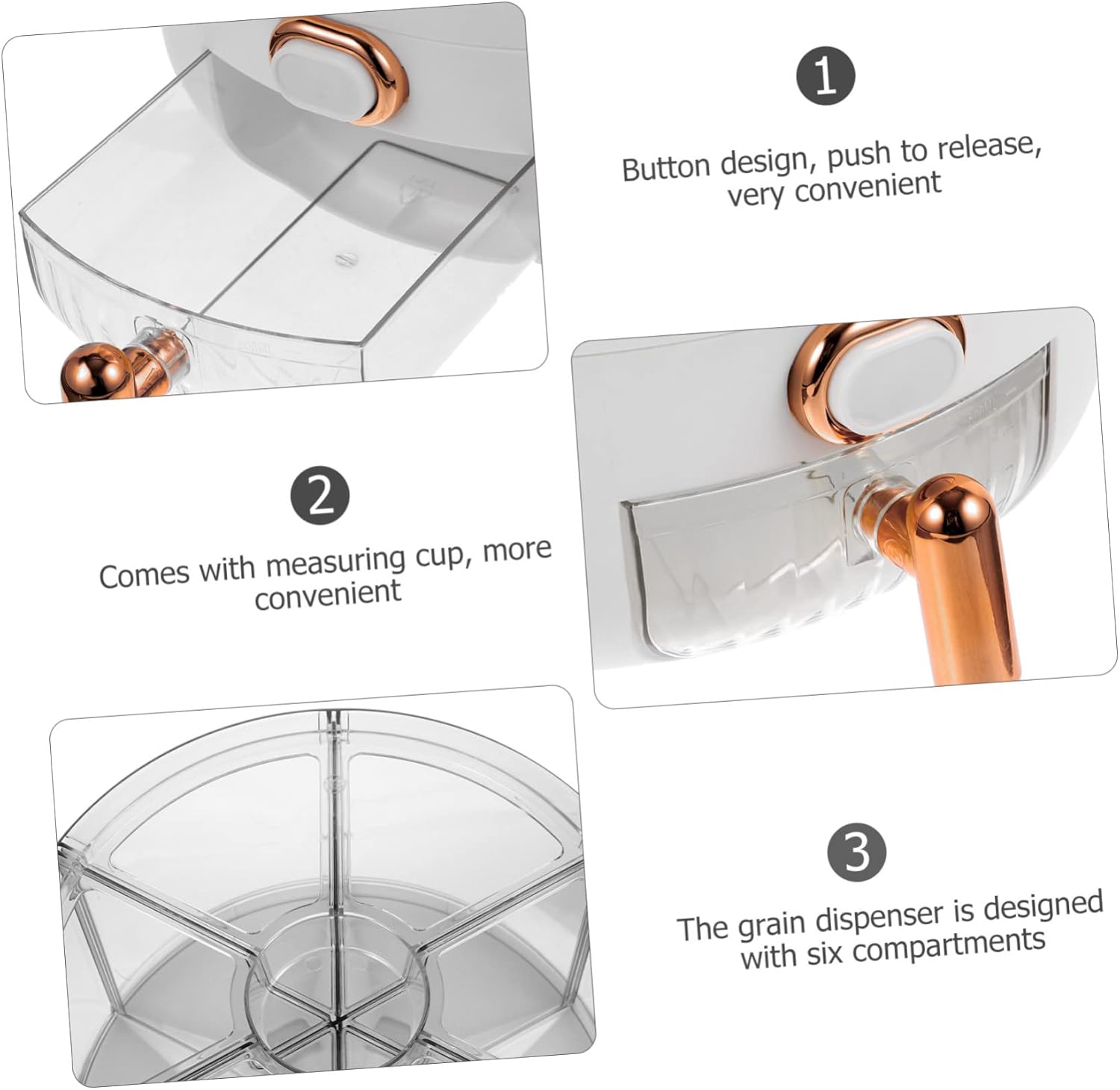 Package Include 1 x rice dispenser Features -Material:PP multiple grain dispenser -Size:22.00X22.00X24.50cm/8.65X8.65X9.63in cereal rice dispenser -Color:White rotating rice dispenser - Button design, push to release, very convenient to get the rice and bean, suitable for daily use grain storage jar. - Suitable for storing of dry food like rice, beans, grains, cereal, etc. A necessary and must accessory for kitchen rotatable food storage container. - Can fit above or under your kitchen counter or cabinet easily. The color matching is simple and beautiful rotating round dry food jar. - Comes with measuring cup, more convenient to control the quantity you need rotating grain storage container. - The grain dispenser is designed with six compartments for sorting and sorting without mixing grains sealed grain storage bucket.Goods Descriptionrotating grain storage This large container maximum freshness and prolonged food storage by sealing tightly.food storage container They will protect your food from air and water so that you never have to worry about your favorite foods turning stale again! Can be used as a housewarming to your friends