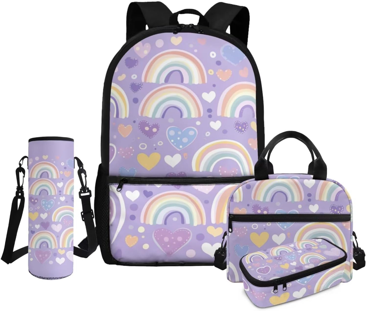 About Product: **Package: --1 Backpack + 1 Lunch bag + 1 Pencil Case + 1 Water Bottle Sleeve **Material: --Polyester **Dimensions: --Backpack: 11x5.1x17.3in/28x13x44cm. --Lunch Bag: 9.1x5.1x8.2in/23x13x21cm. --Pencil Case: 10.2x4.5x3in/26x11.4x8cm. --Water Bottle Sleeve: 10.2x3.8in/26x9.5cm. Tips: 1. More details have been shown in the detailed pictures, please read carefully before purchase. 2. Please note that color variations between the product and the images may occur due to different lighting conditions or screen displays. 3. Easy to clean. Thanks for your business. If you have any questions about the received products, please feel free to contact us directly. We will solve it for you within 24 hours.