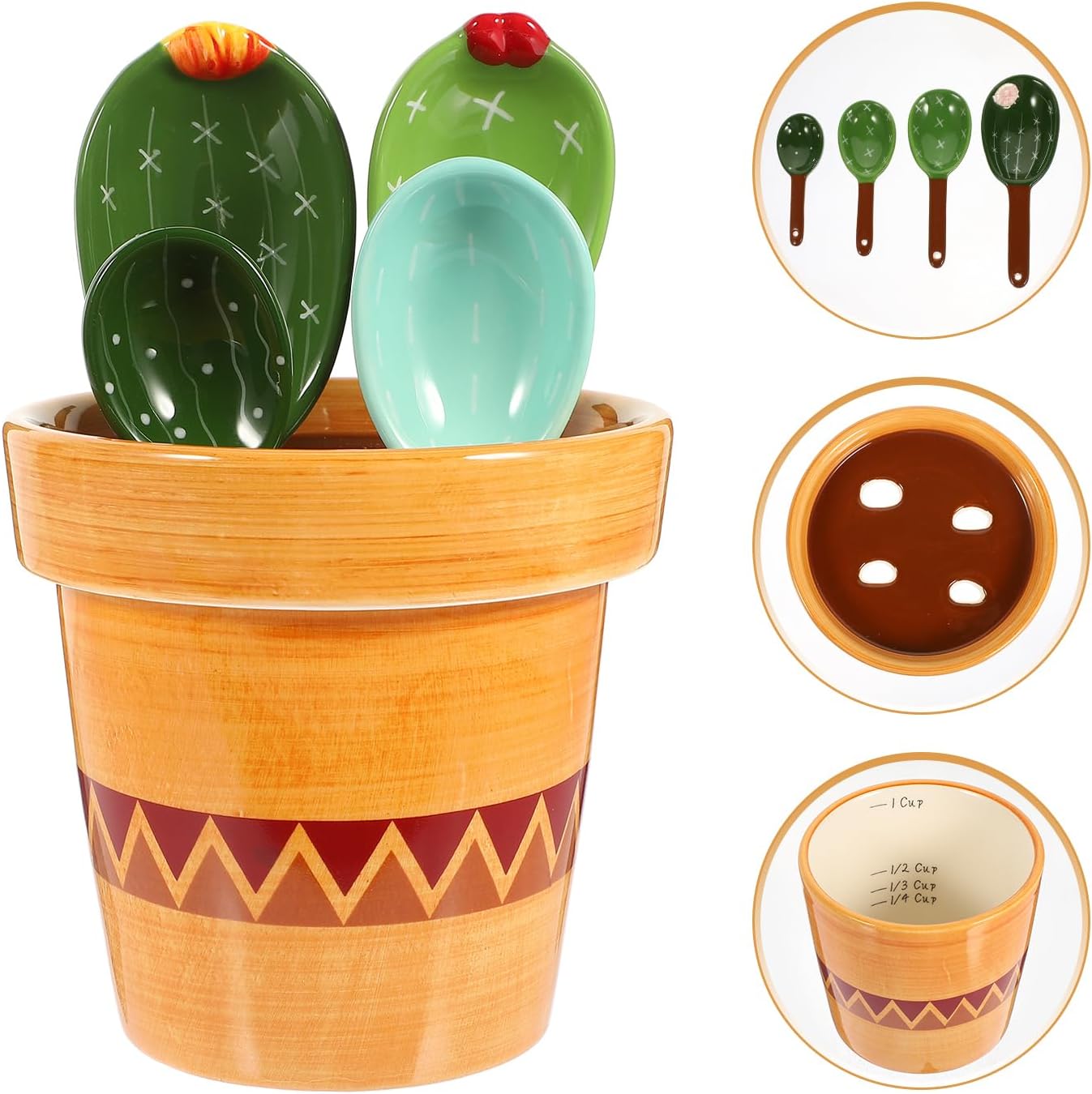 Package Include 4 x measuring spoons 1 x holder Characteristics - Material: Ceramic powder scoop - Size: About 16.00X10.70X10.70cm/6.29X4.21X4 baking measuring spoon. - Spoon Size: About 13.00X4.30X2.20cm/5.11X1.69X0.86in, 10.8x3.8x2.1cm/4.25x1.50x0.83in, 9.5x3.6x1.8cm/3.74x1.42x0.71in, 8.2x3x1.8cm/3.23x1.18x0 ceramic measuring spoon. - Holder Size: About 10.70X10.70X10.00cm/4.21X4.21X3 kitchen utensil. - Holder Capacity: About 290ml salt spoon - Color: Assorted Color sugar scoop - Smooth ceramic material, excellent texture, to wear. It can be sued for a long time Wet & Dry Ingredients Spoons. - Easy to clean, ergonomic handle, comfortable operation. You can use it easily spoon for baking. - Unique split design for easy use and storage. Measures dry and liquid ingredients accurately sugar spoon. - It is fetching condiments, spices, flour, sugar, salt, etc ceramic measuring spoons. - Easy to read with scales on the back of the measuring spoon handle and inside the cup portable ingredient spoon.Goods Informationkitchen measurement spoon Are you looking for a practical measuring spoon? If so, then you must not miss this measuring spoon.graduated scoops It can be used to hold coffee powder, salt, sugar, starch, etc.ceramic figurine This spoon can be used for a long time without and deformation