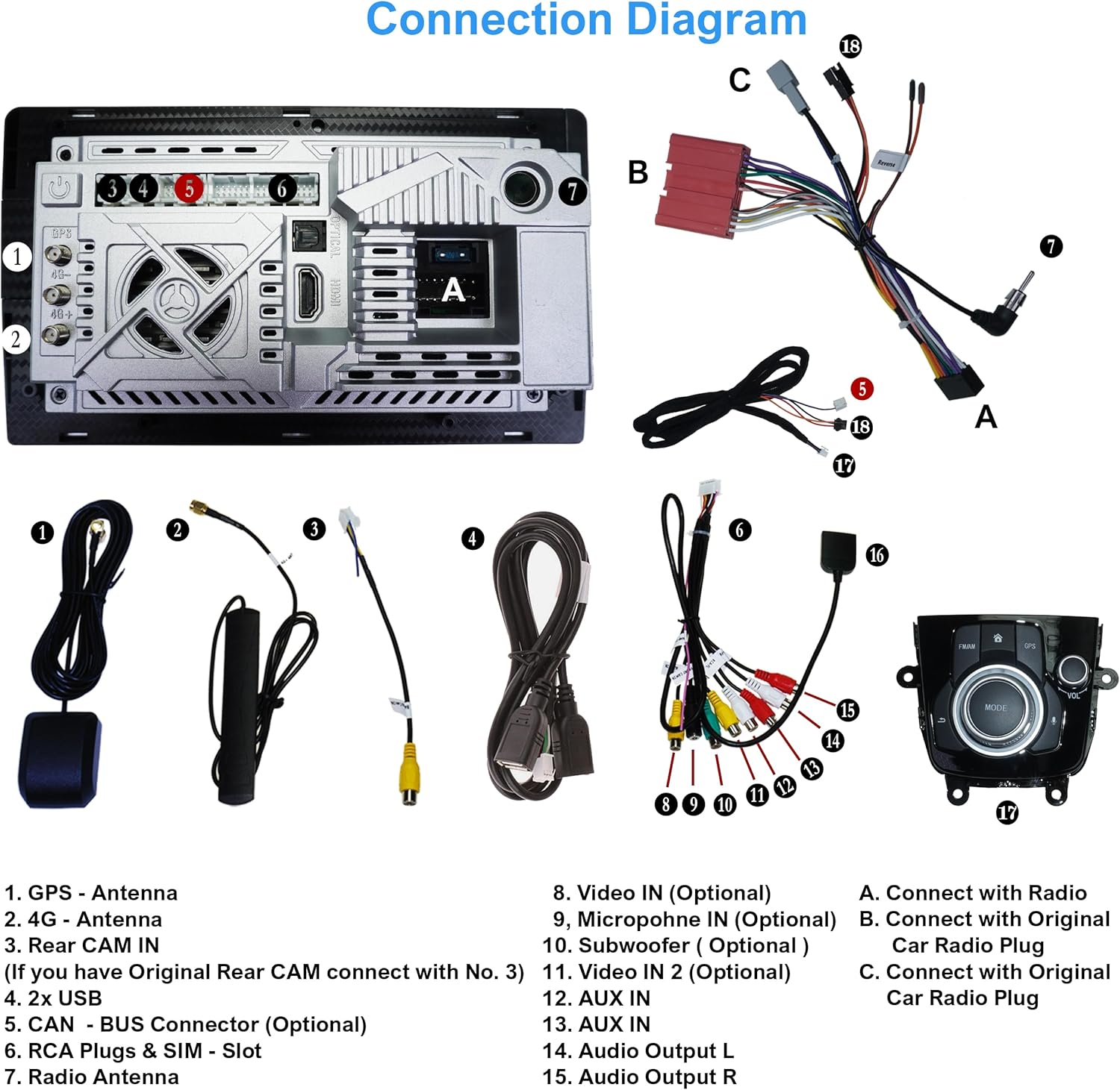 - Support Steering Wheel Control!Main features Intuitive user interface in different languages3D interface, user-friendly control of the system via full graphic screen or buttonsFULL HD resolution with capacitive multi-touch screen controlRadio FM/AM tuner with RDS (Radio Data System, transmission of station name)USB/ iPod connection - for music, pictures and videosBluetooth handsfree phone with synchronization of phonebook contactsUSB/ iPod connection - for music, pictures and videosBluetooth A2DP - music streaming: supports all mobile phones, Android or iPhone2-Zone function - listen to radio, TV or music while you navigateAuto-Memory - All saved settings and positions are automatically retainedBack-Zone Function - Navigate in front and watch TV or video in the backDay and night display functionPlay Stores for Android appsCustom & Reset EQ settings (Pop, Classic, Rock, Jazz, User Bass/ Treble/ Balance Control)Button illumination matching 100% to original car dashboard illuminationRear camera connection - with automatic switching function when reversing4 x audio outputs 1 x AUX A/V input 1 x video input,1x subwoofer and USB portIntegrated Carplay & AndroidAuto function without additional adapter.WIFI integrated: for direct connection with WLAN hotspots, smartphone.4G LTE sim card slot for mobile internet without W-LAN