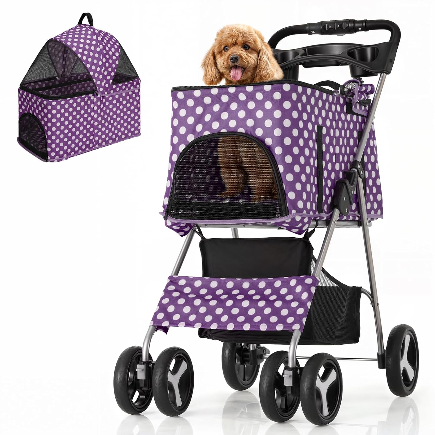 The Polias Dog Stroller in navy blue is a practical 3-in-1 design for medium dogs and cats up to 33 lbs. This foldable pet stroller features a detachable carrier, ideal for travel or vet visits. Its smooth-rolling wheels ensure effortless maneuverability on various terrains.With breathable mesh windows for ventilation, a spacious interior for comfort, and a storage basket for essentials, this dog stroller for medium dogs is perfect for daily walks or errands. The built-in cup holder adds convenience, keeping your drinks handy. Lightweight yet sturdy, this pet stroller for dogs and cats offers comfort and reliability for you and your pet.