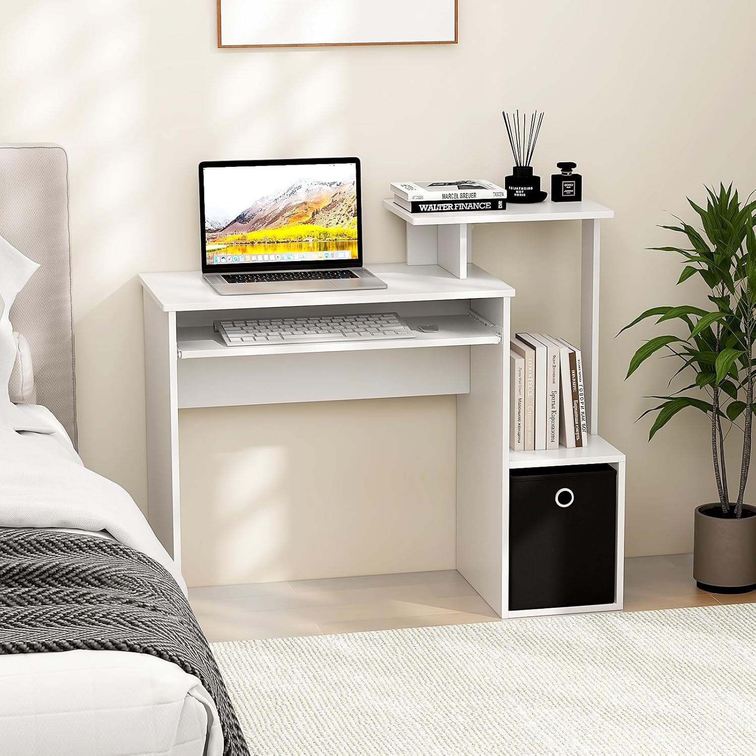 Description:This home office desk is designed to meet the needs of modern living while offering exceptional functionality and style. Featuring dual desktops, it provides ample space for work, study, or creative projects, while a spacious lower cabinet ensures easy access to books, files, and essentials. Its compact design maximizes your workspace without cluttering your home, making it ideal for smaller spaces. Built to last, with an ergonomic keyboard tray and non-slip foot pads, this desk offers both comfort and durability for any task.Feature:Features multiple storage options for books, plants, decorations, and filesOpen tabletop shelf, pull-out keyboard tray, and spacious cabinet top provide ample storageRemovable and foldable fabric storage bin offers flexible organizationRounded corners for safety, preventing accidental bumpsSleek, waterproof surface for easy cleaning and maintenanceMulti-functional desk, perfect for work, gaming, or studyingCompact, space-saving design ideal for apartments, dorms, and small officesAssembly requiredSpecification:Color: Black/White + BlackMaterial: Engineered Wood, MDF, Non-woven FabricOverall Dimensions: 39.5" x 15.5" x 34" (L x W x H)Dimensions of Tabletop Shelf: 17.5" x 12" (L x W)Tabletop Height: 28.5"Dimensions of Keyboard Tray: 26.5" x 10" x 3.5" (L x W x H)Dimensions of Bottom Cabinet: 15.5" x 10" x 14" (L x W x H)Dimensions of Fabric Drawer: 14" x 9.5" x 12" (L x W x H)Weight Capacity of Tabletop: 200 lbsWeight Capacity of Tabletop Shelf: 45 lbsWeight Capacity of Cabinet Top: 45 lbsWeight Capacity Fabric Drawer: 25 lbsNet Weight: 42.5 lbsPackage Includes:1 x Computer Desk1 x User Manual