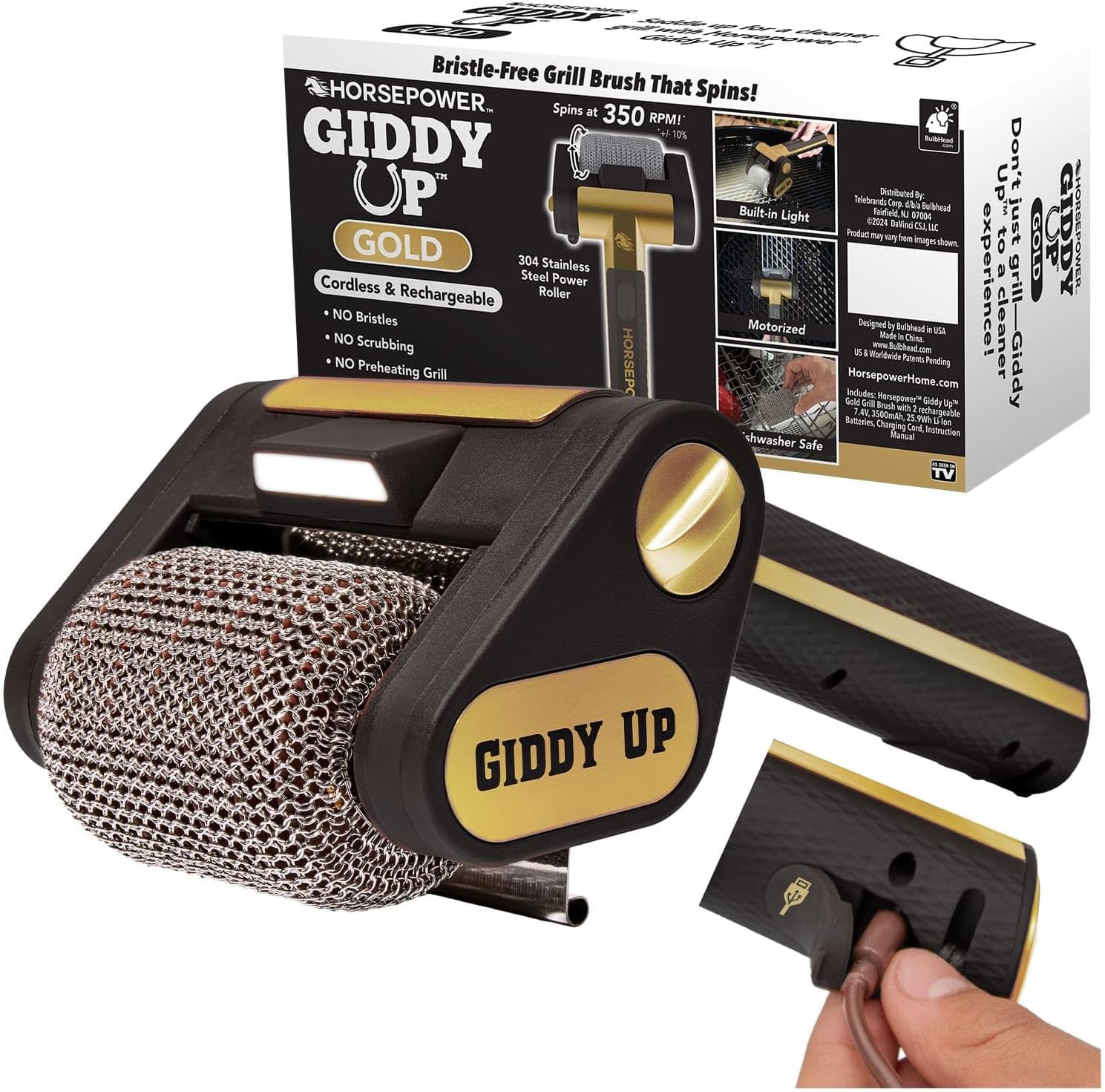 Say hello to the Horsepower Giddy Up, the grill brush that makes cleaning a breeze! This powerful, bristle-free spinning brush is designed to tackle even the toughest grill messes. With a 304 stainless steel roller that spins at a blazing 350 RPM, it wipes out burnt-on food and grime in seconds—leaving your grill spotless and ready for your next BBQ. No cords, no hassle! The Giddy Up is cordless and rechargeable, so you can clean your grill anywhere, anytime, with total freedom. Made from high-quality 304 stainless steel, this brush is built to handle the messiest grills and keep going for years. Worried about bristles ending up in your food? Not with Giddy Up! Its bristle-free design keeps your BBQ safe while delivering a deep, thorough clean. Let the Horsepower Giddy Up handle the dirty work so you can focus on what really matters—grilling up delicious meals with ease. Perfect for anyone who loves grilling and wants an easy, efficient way to keep their grill in top shape!