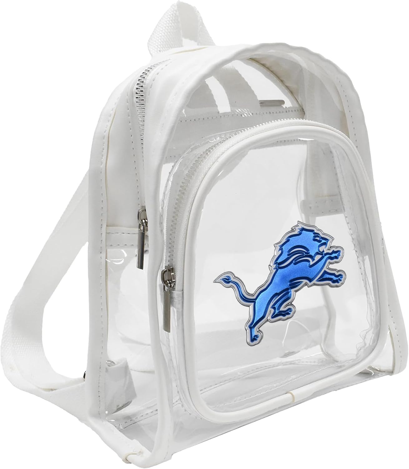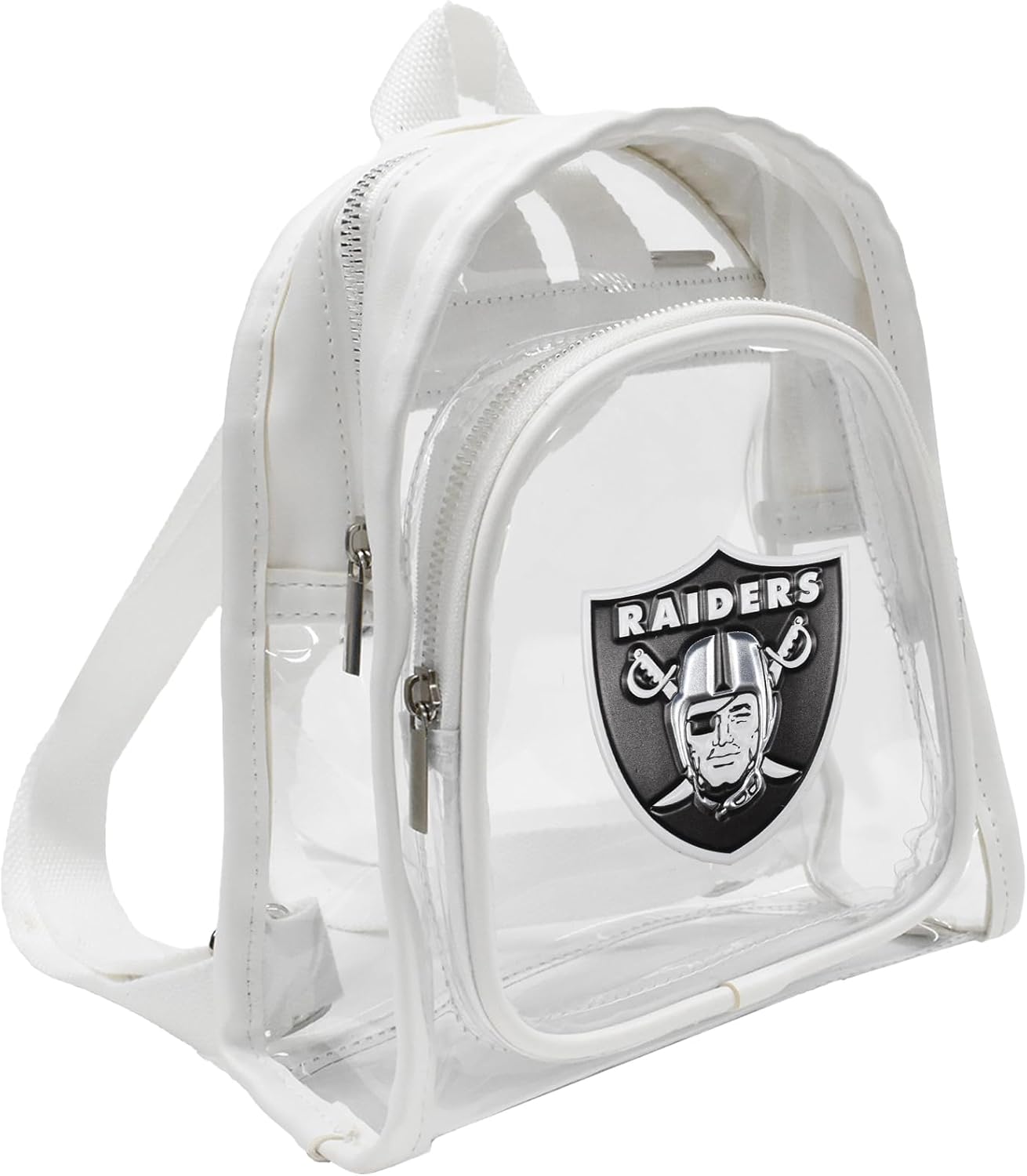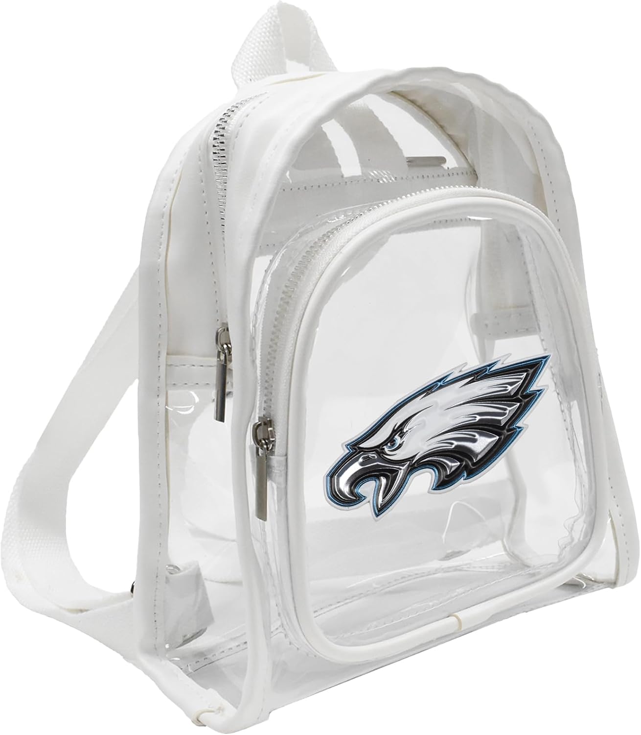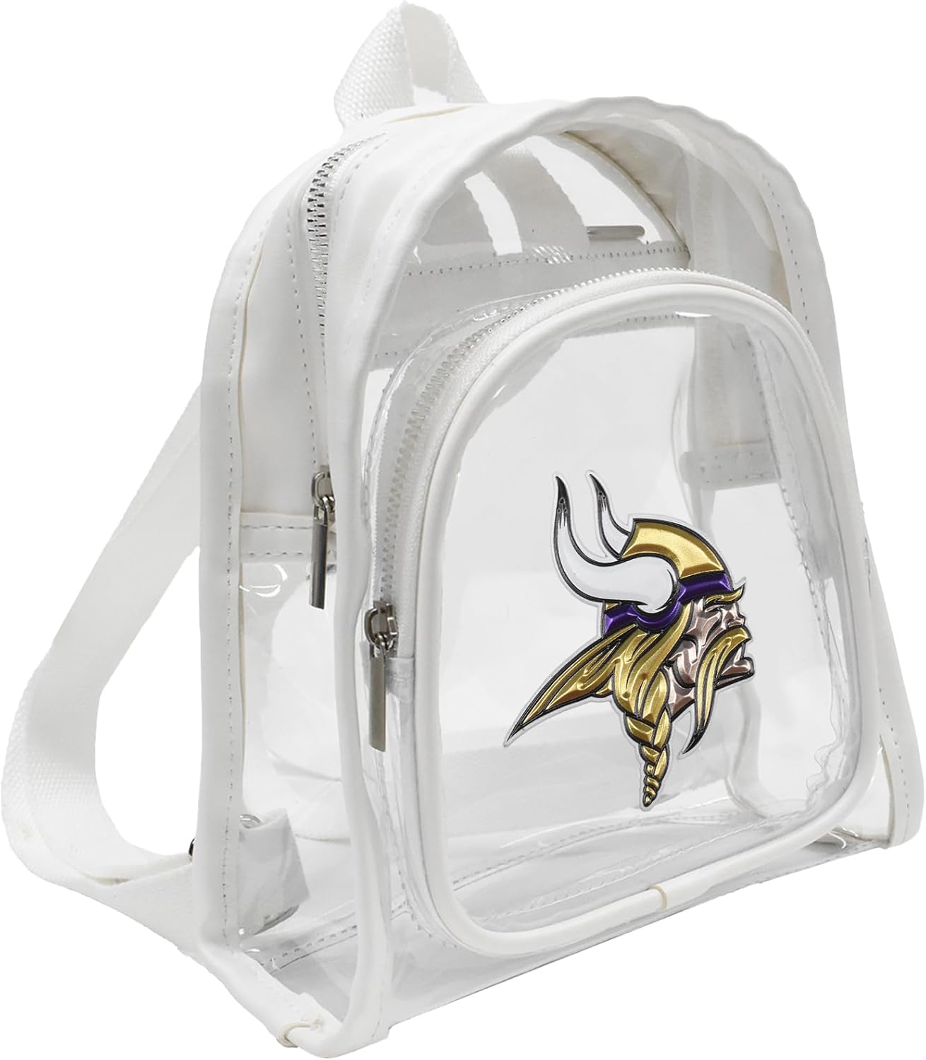 Cheer on your team in style with this clear mini backpack from Littlearth, the ultimate game day companion! Designed for convenience and security, it features a spacious main compartment and a smaller front compartment, both secured with leatherette zip panel closures. Made from durable PVC with sleek white polyester trim, this bag is built to last through every game. Adjustable cotton straps ensure comfort, while nickel-plated hardware adds a touch of polish. Show off your team spirit with the bold 3D logo, and rest easy knowing it complies with most stadium policies. Perfect for fans on the go!