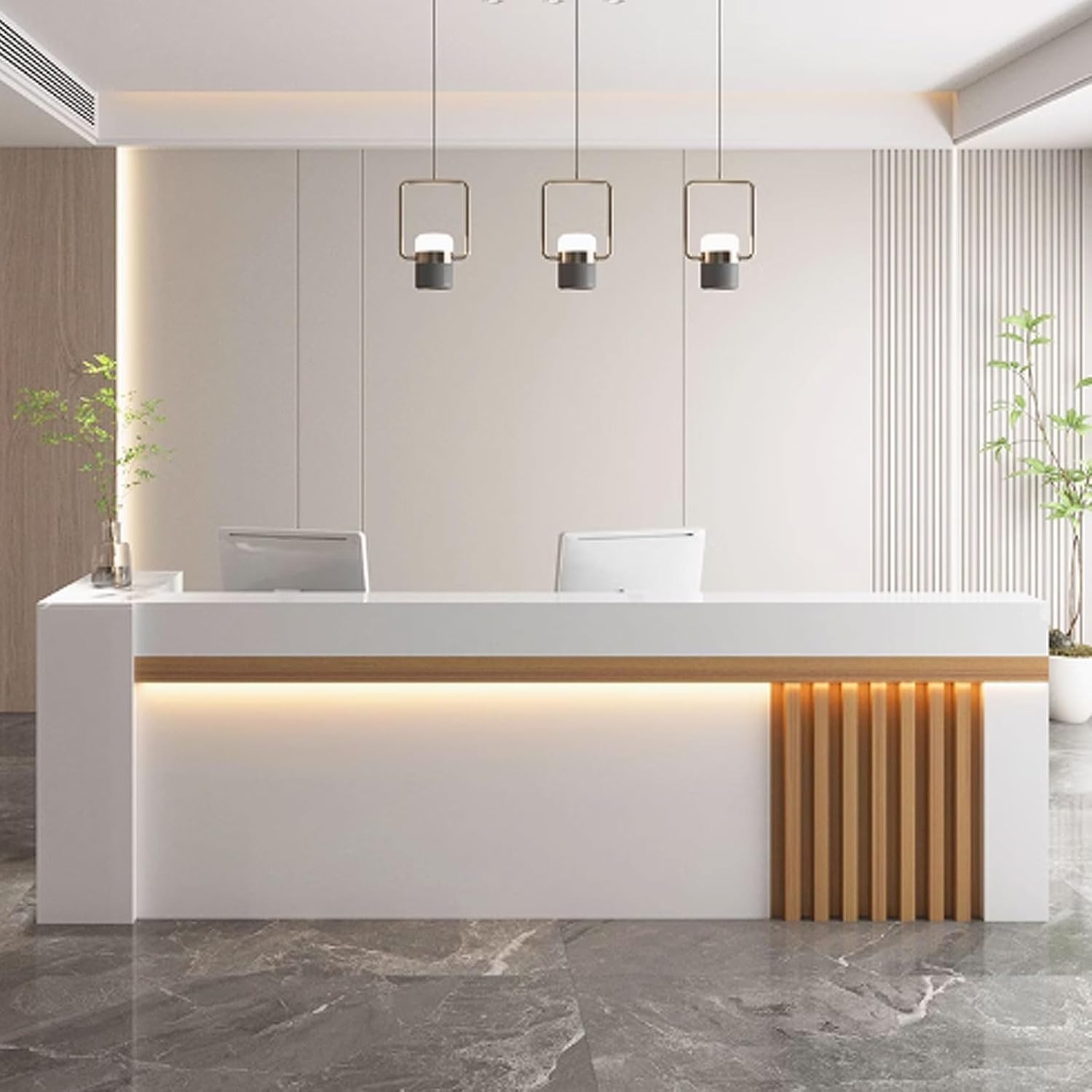 GUQASDV receptionist desk for salon will be a helpful solution to keep your work essentials organized and your workspace neat in reception area to improve work efficiency and create high-end sense to the scenesFine workmanship: processed by fine workmanship, every details are polished fine without burrs to avoid accidental injuries, receptionist desk with storage will not make hurts easily even for kidsInstallation: under the guidance of detailed instruction, you are sure to figure out how to put all parts together in a short timeMaterial: E1 Engineered WoodLights: LED light stripsColor: white texture, white texture + black, white texture + brown, white texture + natural, white texture + white, white texture + gray, white texture + gray texture, white texture + black texture, gray texture + black, white + light brown, white + light gray, white + natural, white + gray textureSize: 100x60x100cm, 120x60x100cm, 140x60x100cmNote: 01 There may be a 3-5cm error in manual measurement which is normal, please understand02 Due to different displays or shooting environments, the product may have color differences, please understand