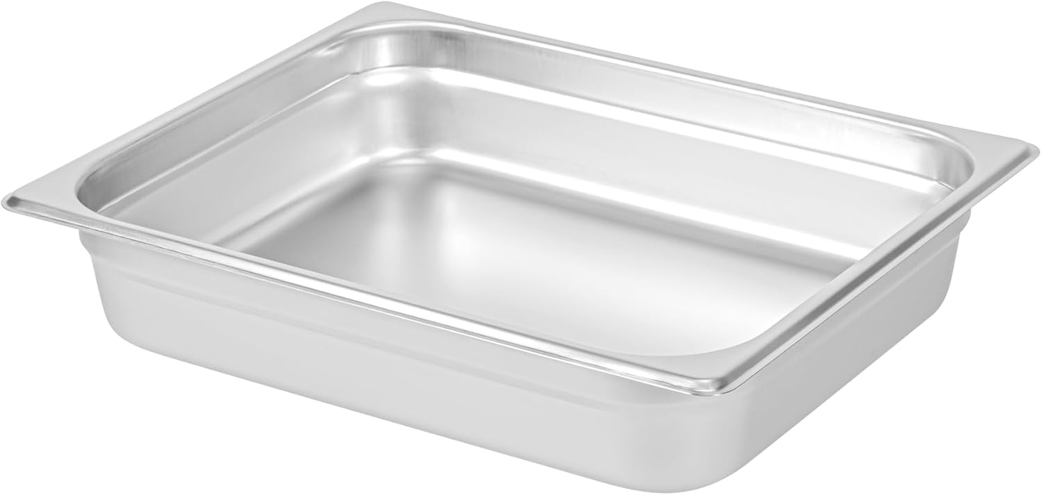 Maximize the efficiency and presentation of your culinary offerings with our Kitchen Tek Stainless Steel Full Size Steam Table Pans. Engineered with anti-jam stacking lugs, these hotel pans offer no-hassle separation and easy lifting, making them ideal for busy food establishments. These steam table pans are constructed from 24 gauge 18/8 stainless steel and ensure robust durability to endure various kitchen tasks. Pair these buffet pans with its compatible lids (SKUs: RWT1610S and RWT1618S) to protect your food. These steam pans comply with NSF standards for foodservice establishments. The 6-inch depth of these metal steam pans offers ample storage for storing and serving large quantities of food. With an oven-ready design, these stainless steel pans can withstand temperatures up to 1600F and are ideal for various culinary tasks. These metal pans are freezable and allow convenient storage of prepared foods to maintain freshness. The heavy-duty construction of these catering pans ensures longevity and is ideal for serving hot and cold foods. For an easy cleaning experience, these buffet steam pans can be used in a commercial dishwasher. These oven-ready pans measure 20.8 inches in length by 12.8 inches in width by 6 inches in depth. Sold in a 6 count box. Lids are available and sold separately.