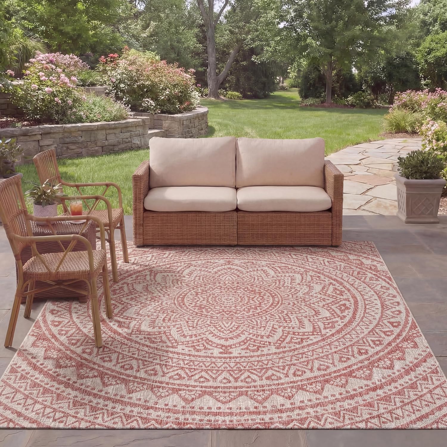 Safavieh' s Courtyard Collection is inspired by timeless designs crafted with the softest polypropylene available. This rug is crafted using a power loomed construction and features a main accent color of natural. Perfect for any backyard, patio, deck or poolside, this rug will instantly turn your outdoor area into a resort-style entertaining space. Finely crafted for seasons in the sun and years of open-air gatherings, the Courtyard rug instantly elevates any interior or exterior décor to a space of visual inspiration. More than a decorative enhancement, this rug is both and - to ensure carefree maintenance. With its style, practicality, and transitional decorating options, this rug extends an open invitation to gather and may just spark impromptu parties. Primary Color: Terracotta Pile Height: 0.25 inches Material: Polypropylene Style: Contemporary Construction: power loomed Rug Type: Indoor/Outdoor Feature: Latex Free Rug Dimensions: 6'7" x 9'6"