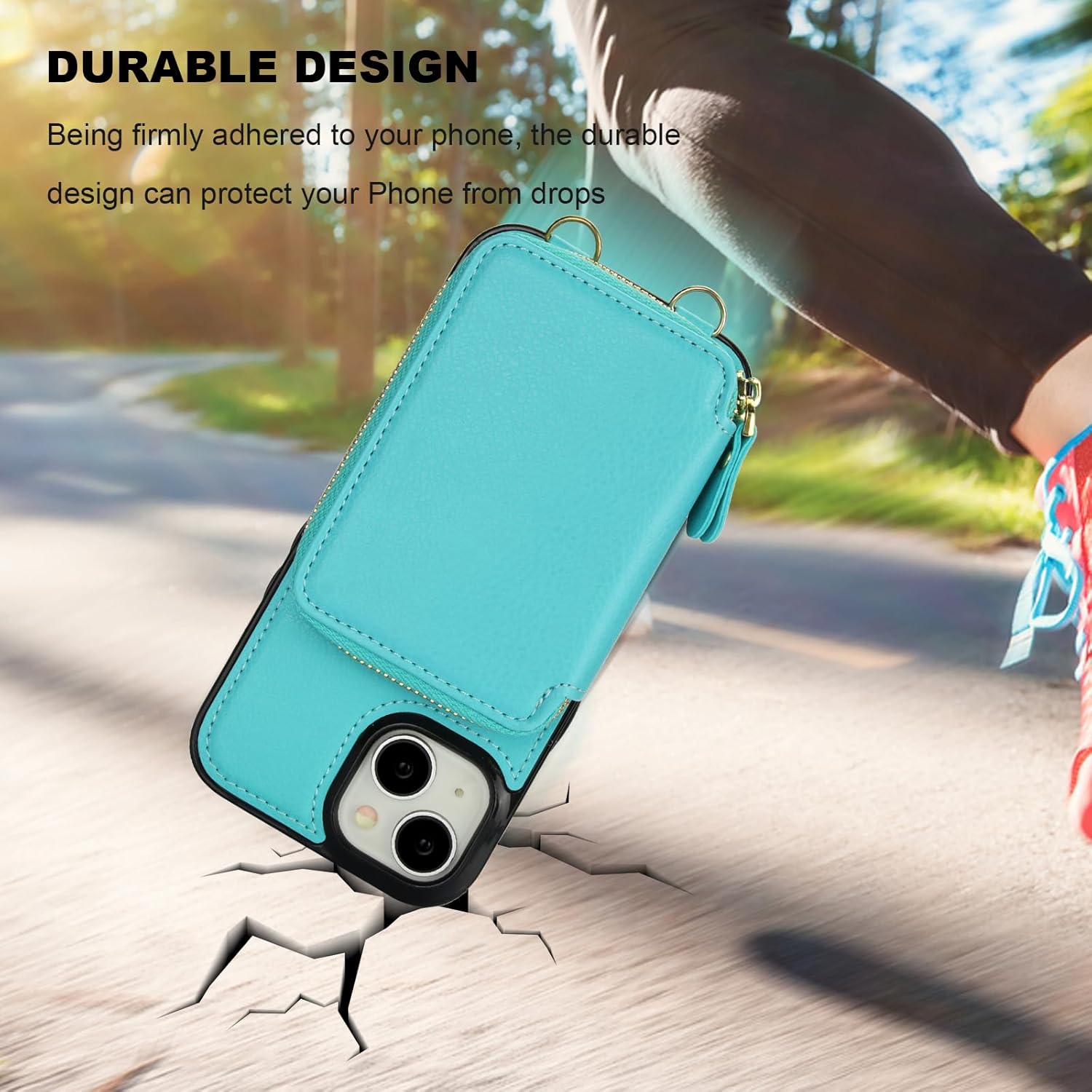 Bocasal iPhone 15 Zippered Crossbody Wallet Case with Card Holder 6.1 Inch (1)Compatible with: iPhone 15 6.1 Inch Display. (2)Color: Black/Brown/Rose Gold/Red/Mint Green. (3)Material: Premium Faux PU Leather. Features: 【RFID Shielding Material】: We adopt RFID shield material to protect your information data in the chips of your cards from stealing through radio signals. 【Removable Lanyard & Adjustable Shoulder Strap】: The attached anti-lost lanyard and detachable crossbody chain strap whose length can be adjusted is convenient when traveling, shopping, hiking, and so on. 【Large Capacity Crossbody Wallet Case】: The card slots can contain your cards as well as some cash while the zipper design can keep your belongings safe by ensuring the complete enclosure of the wallet part. 【Practical Kickstand Feature】: The stand function helps free your hands when reading e-books, having video chats, seeing movies, and so on.