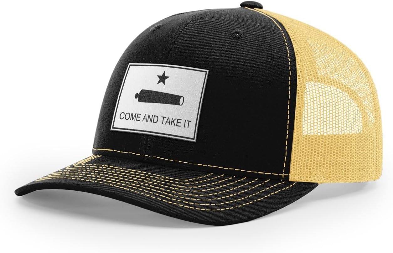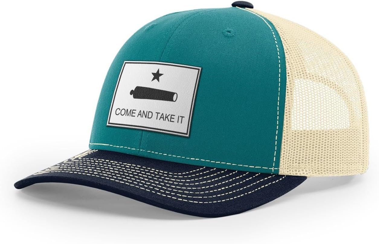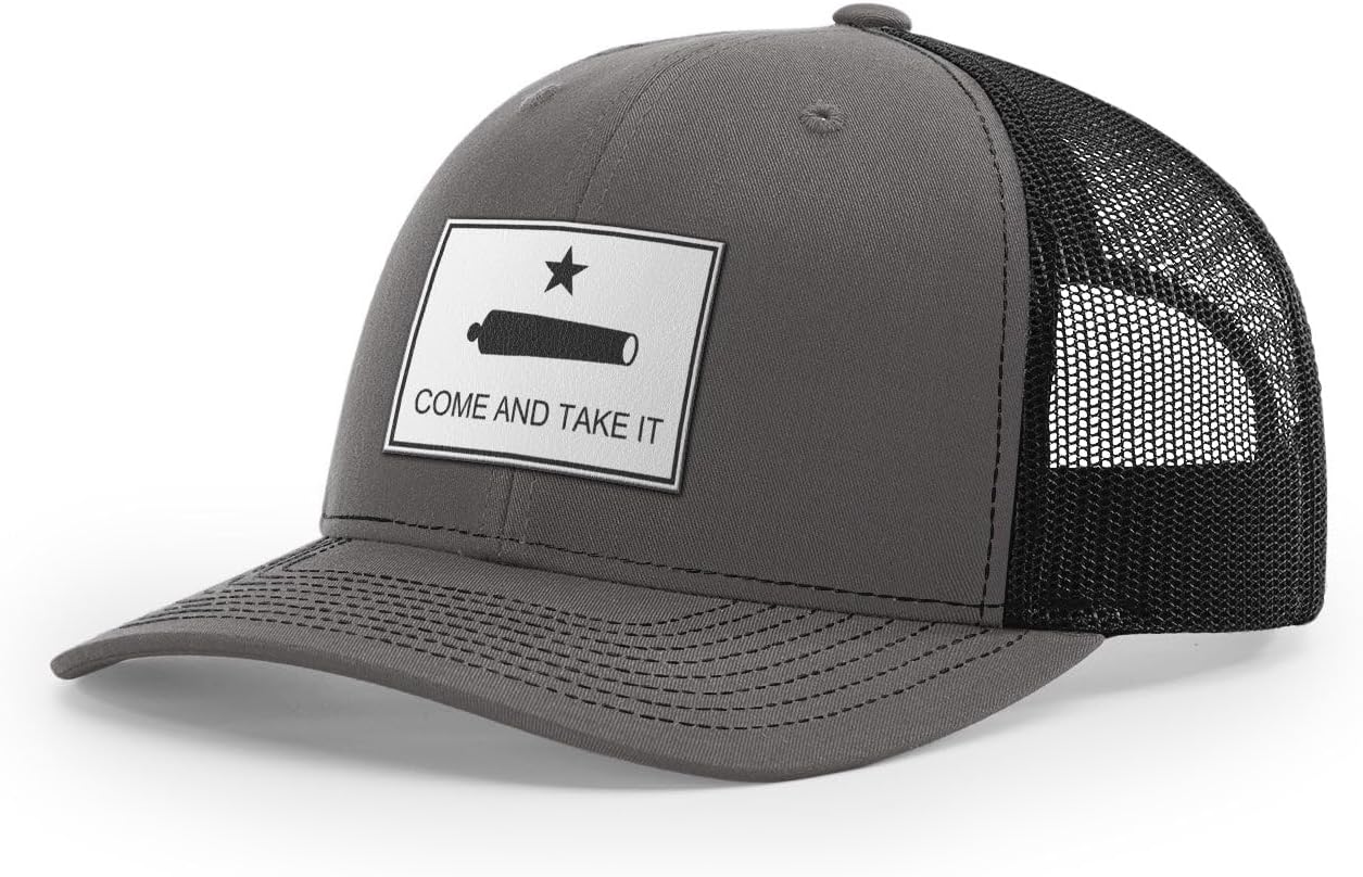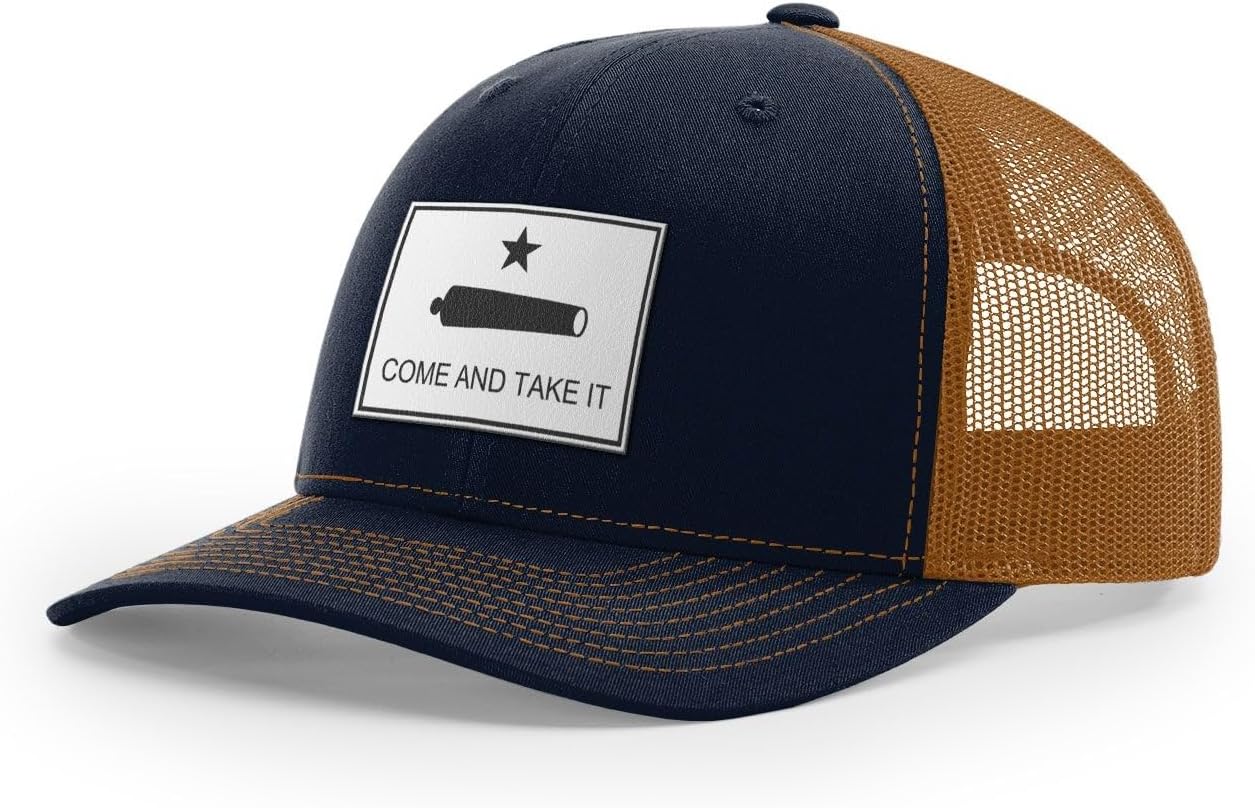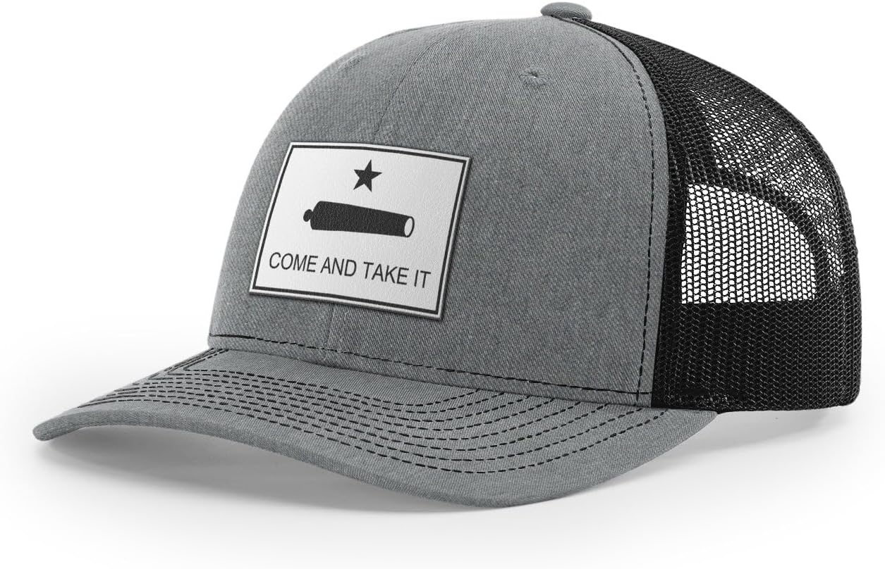 Come And Take It. The famous phrase from the famous Texas flag. It's not just a motto but a core belief & way of life.We take the classic Richardson 112 snapback trucker and then add a high quality leather patch. The Richardson 112 is the standard in truckers caps with unbeatable quality and consistency from 50+ years of product excellence.Key features include: 60/40 cotton/polyester 100% polyester mesh back Structured, six-panel, mid-profile Pre-curved visor Underbill matches the color of visor Adjustable plastic snapback OSFMWe only sell high quality products that we do actually wear ourselves. We sourced the hats that you will truly want to wear and we've paid careful attention to the graphic design details. Everything is designed and assembled in Texas.Check our other listings for black leather and brown leather options.