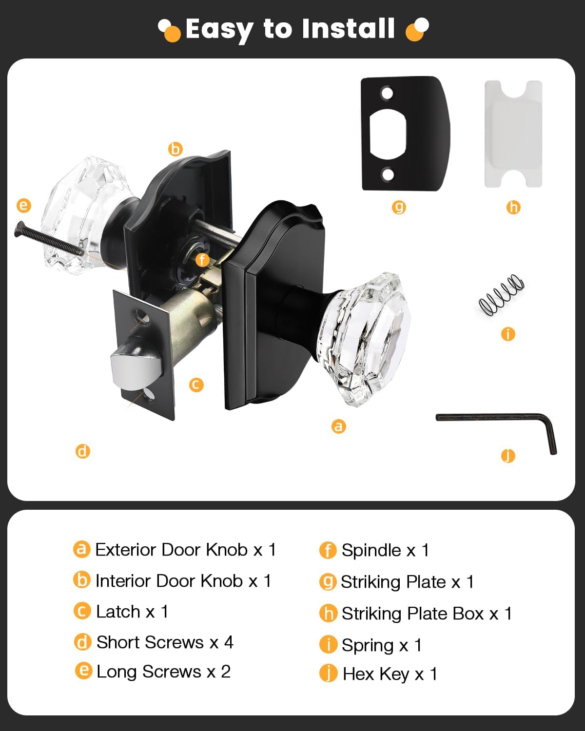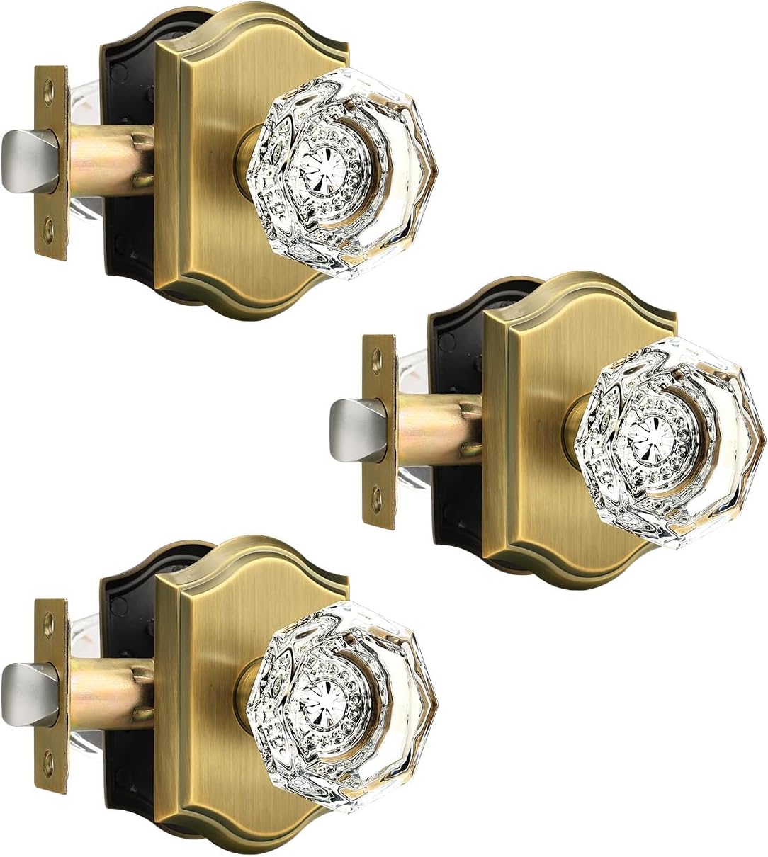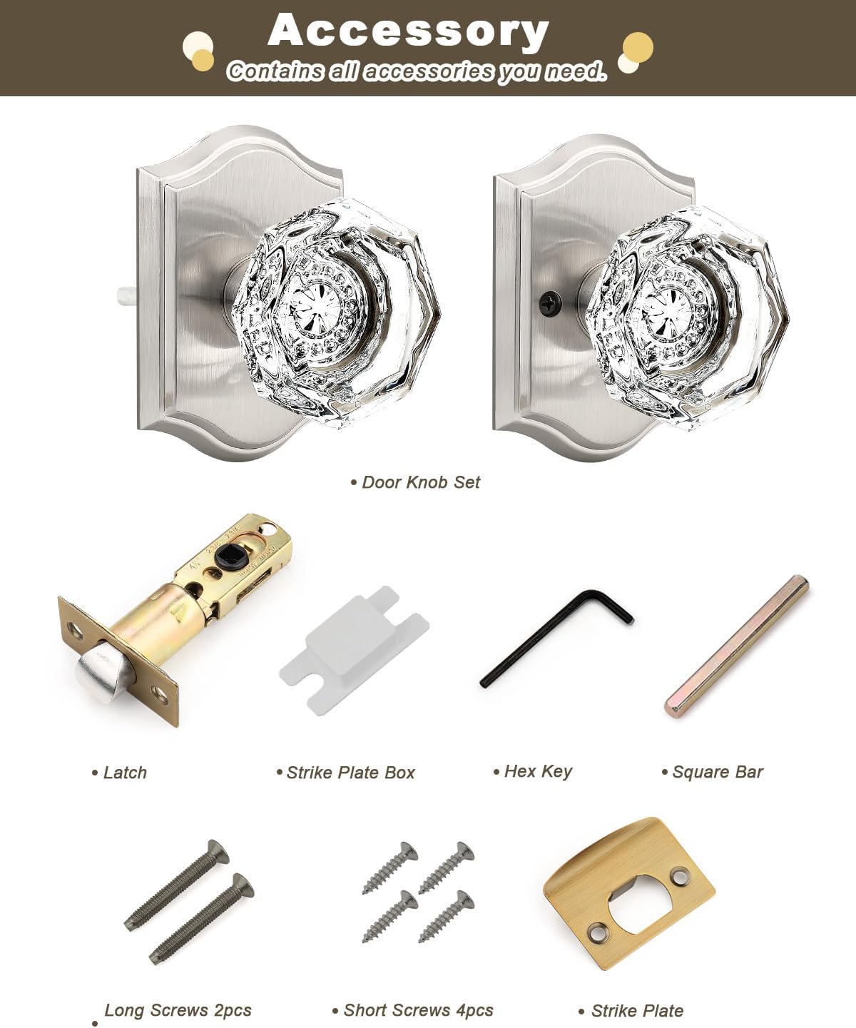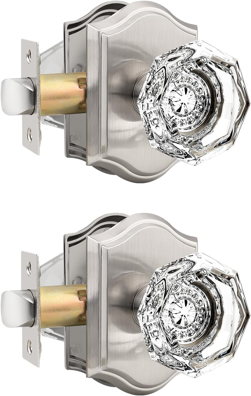 | Included Components | Crystal glass knobs(interior & exterior knob),adjustable latches with undetachable plate,spindles,plastic covers,strike plates,hex keys,screws,installing insructions |