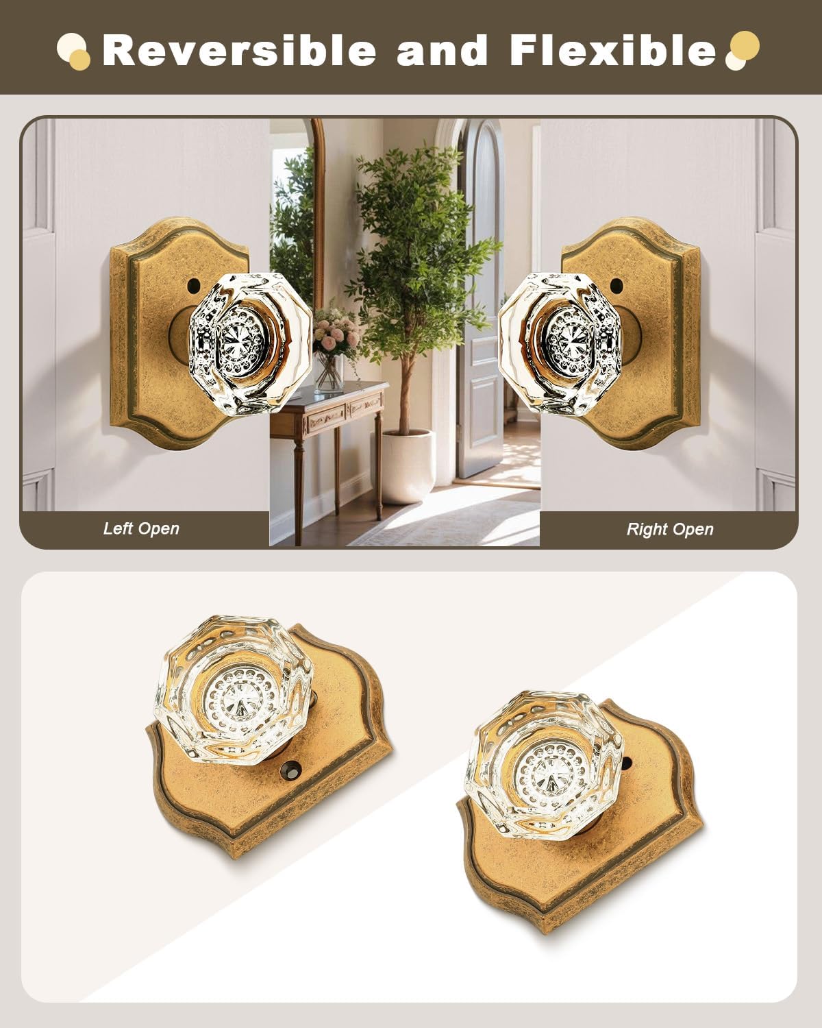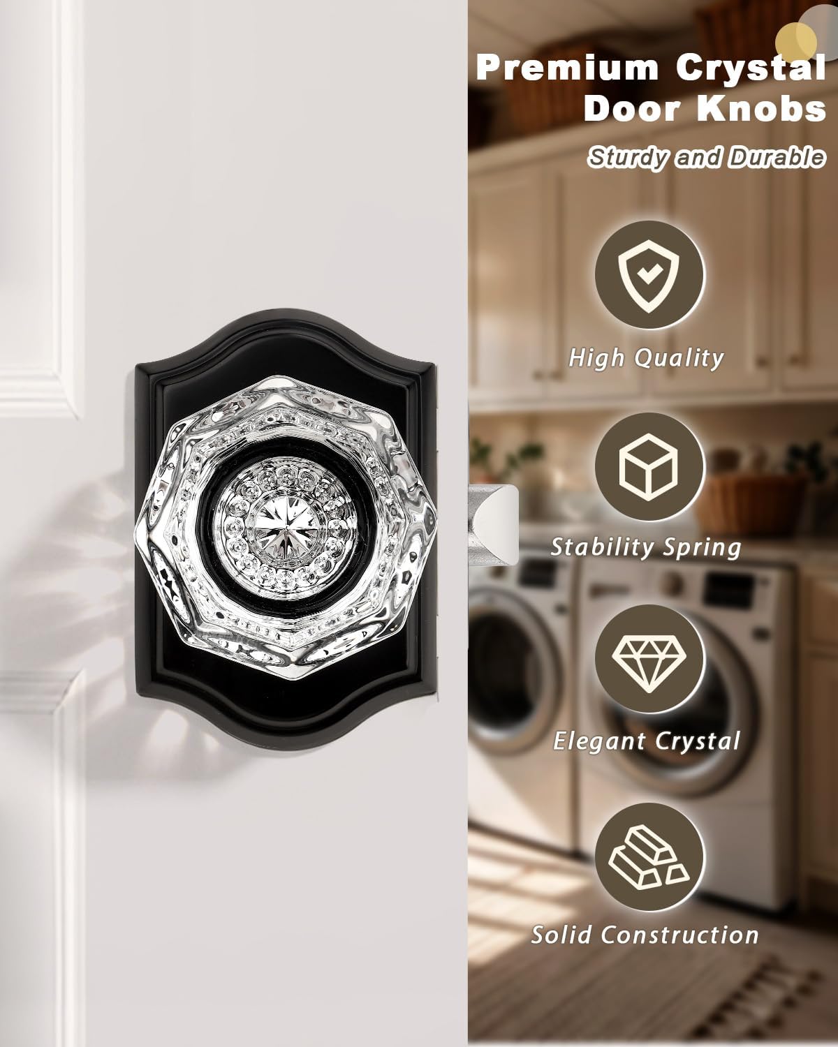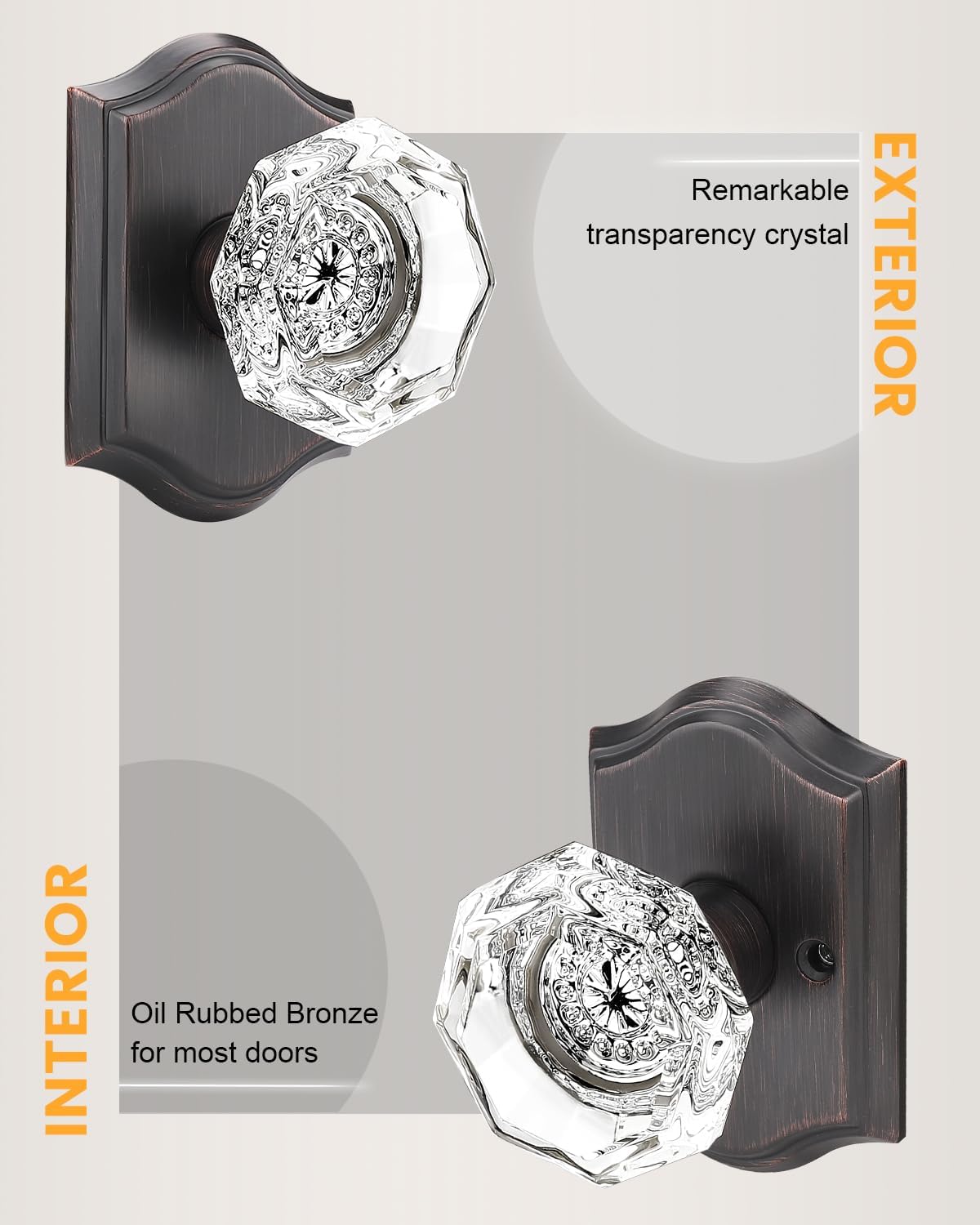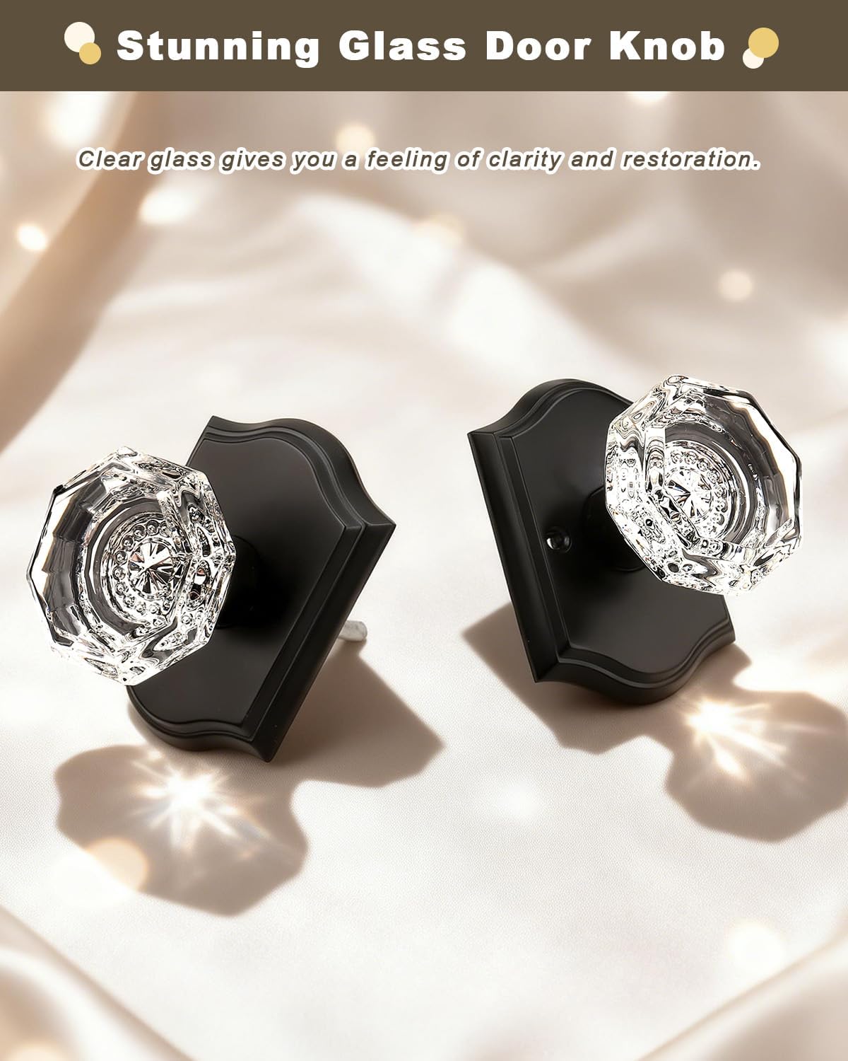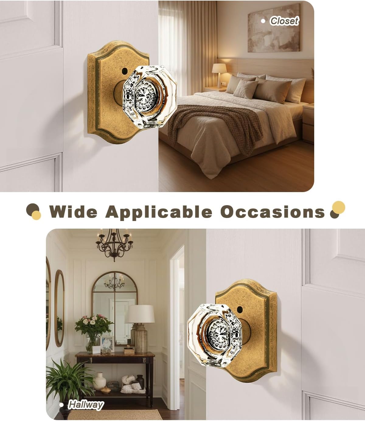 | Included Components | Crystal glass knobs(interior & exterior knob),adjustable latches with undetachable plate,spindles,plastic covers,strike plates,hex keys,screws,installing insructions |
