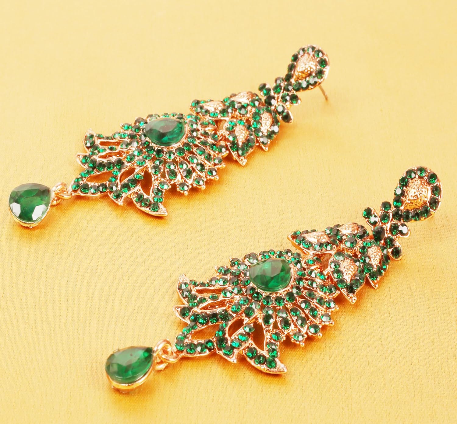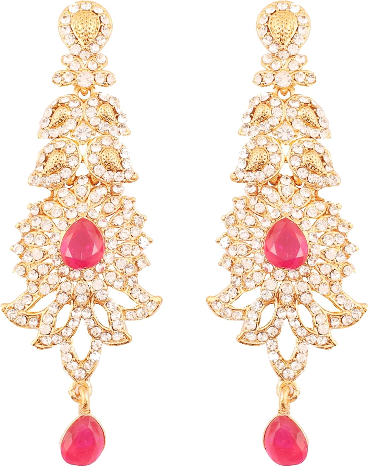 Alloy metal, beautifully created paisley theme inspired white Austrian crystals pear shape stone long designer chandelier earrings in antique gold tone.